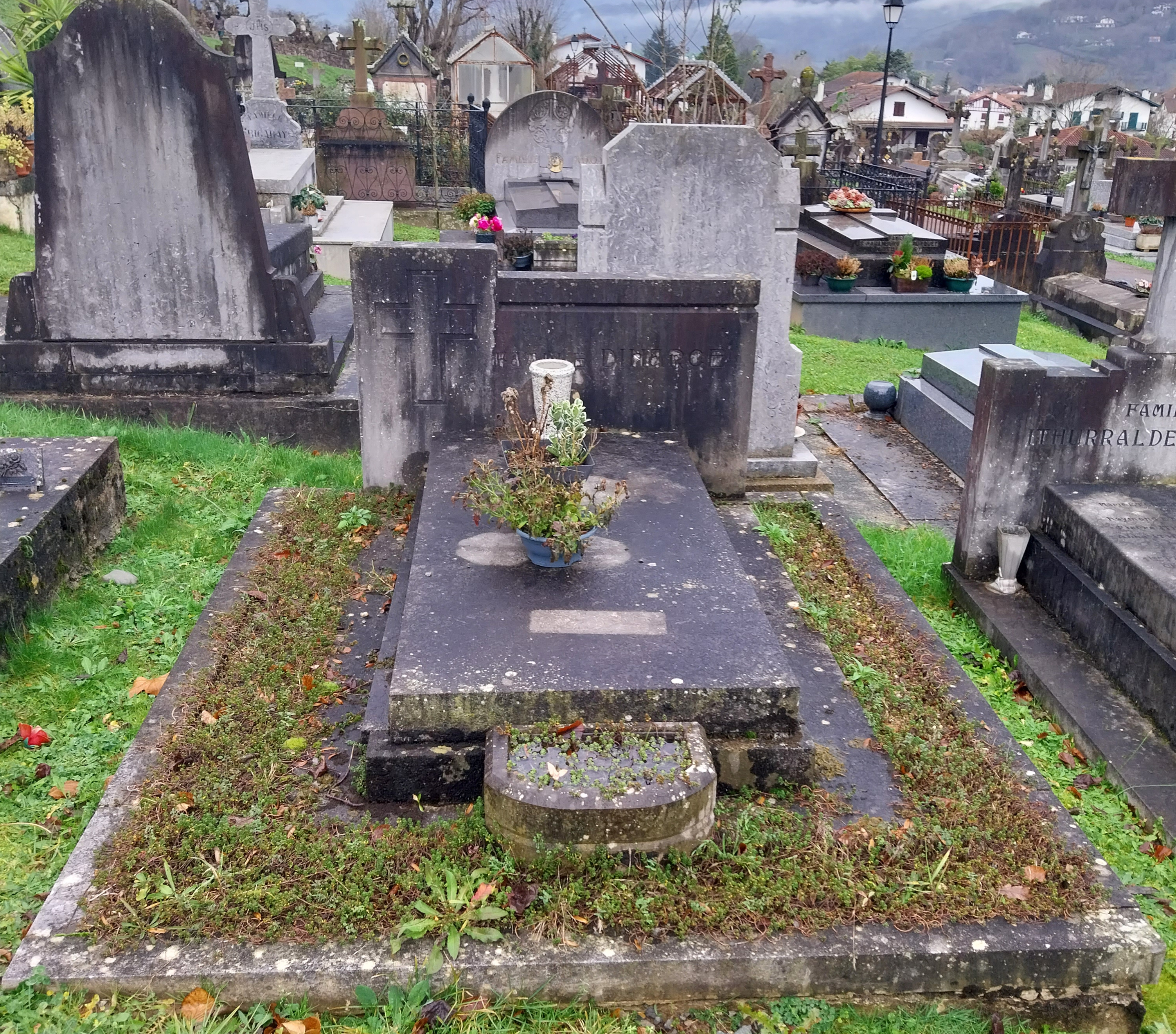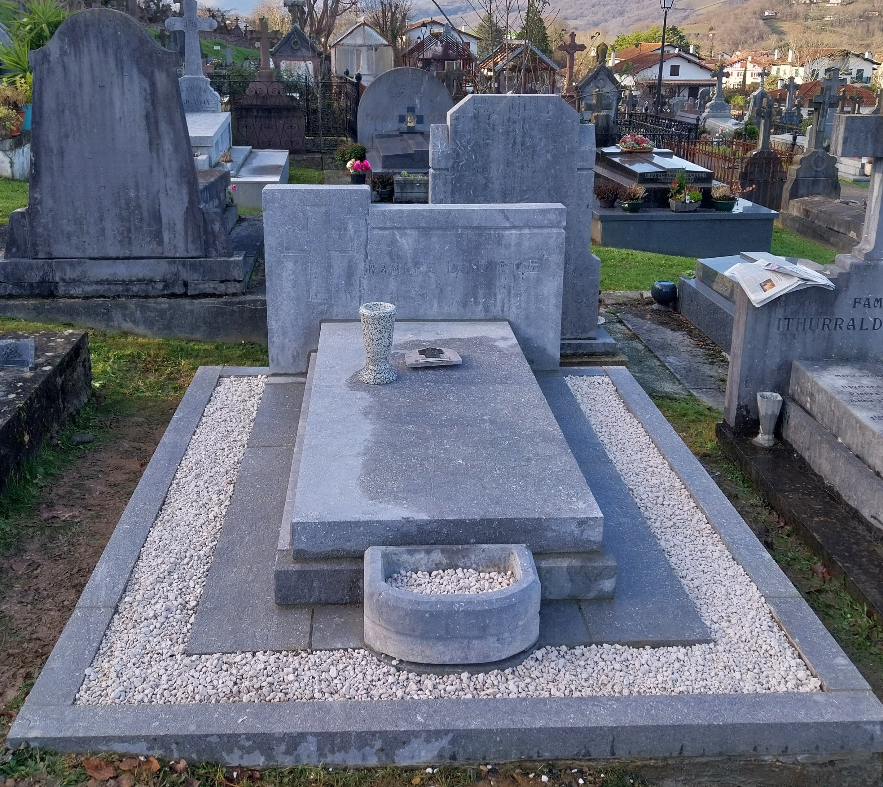 Pour ce monument funéraire, la Marbrerie GDDM a réalisé un nettoyage et une réfection de joint d’un monument en Arudy. Retrait des anciens graviers et des mauvaises herbes. Pose d’un géotextile et de nouveaux graviers.