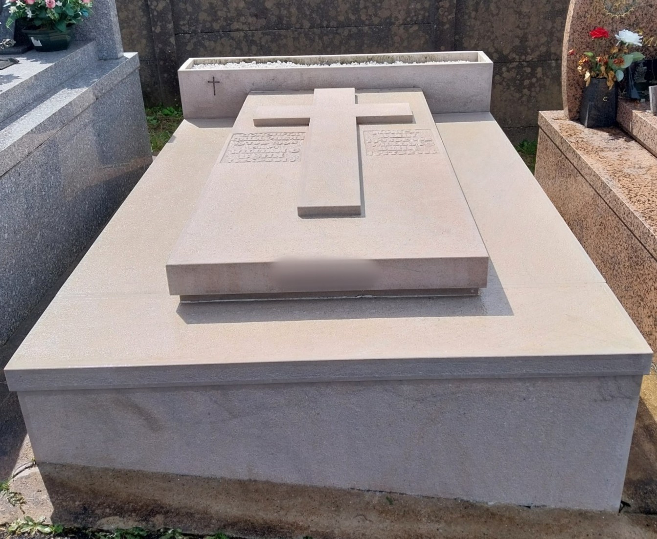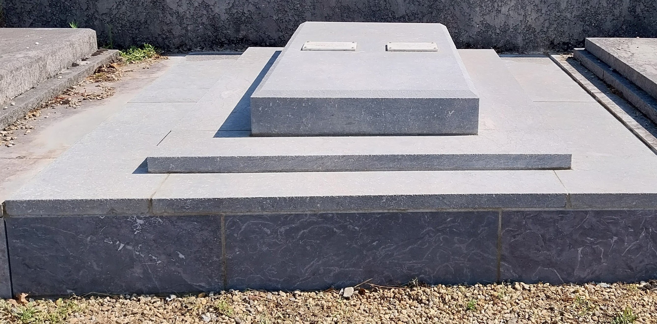 Nettoyage d’un monument funéraire en pierre. La Marbrerie GDDM prend soin de vos monuments et les remet en état. Pour ce Monument, retrait des champignons, nettoyage en profondeur de la pierre.